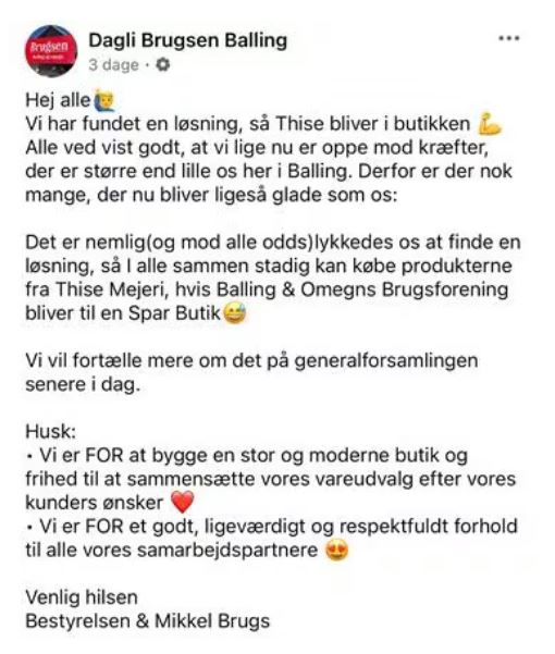 Lokalbefolkningen valgte Dagrofa, men prisen var (lokalt set) høj: Thise, der i 30 år har været Coops partner, stoppede leverancer til de lokale købmænd, der ikke længere er en del af kæden.