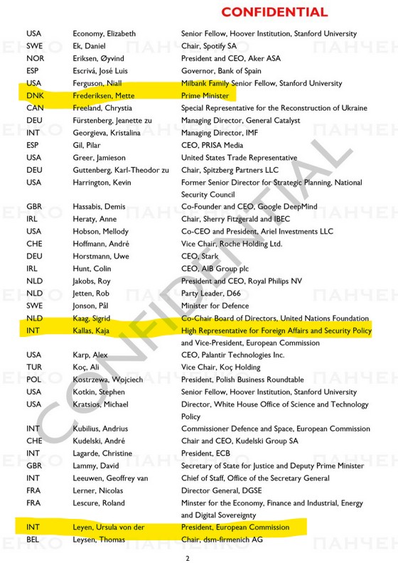 Listen viser landekoder og navne på ca. 120–150 personer. Navne som Ursula von der Leyen, Kaja Kallas, Mark Rutte (NATO), Alex Karp (Palantir), Eric Schmidt, Peter Thiel, Satya Nadella og den skandaleramte nordmand Børge Brende (WEF), der havde et meget varmt og nært venskab med Jeffrey Epstein længe efter Epstein var blevet dømt første gang, figurerer på listen.